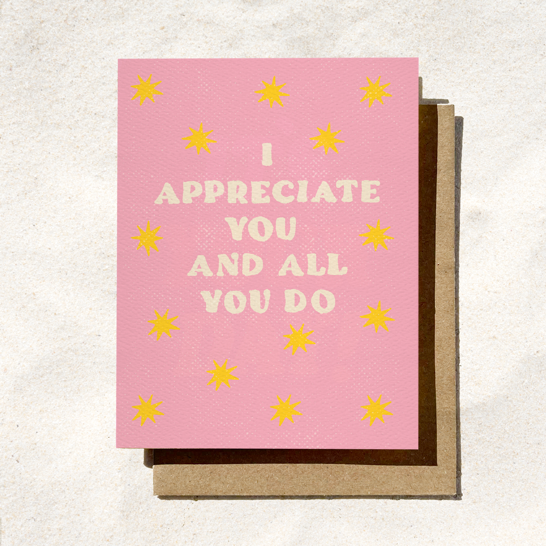 A cheerful pink card adorned with bright yellow stars, perfect for showing gratitude and appreciation for all someone does. Ideal for friends, coworkers, or loved ones who deserve recognition.