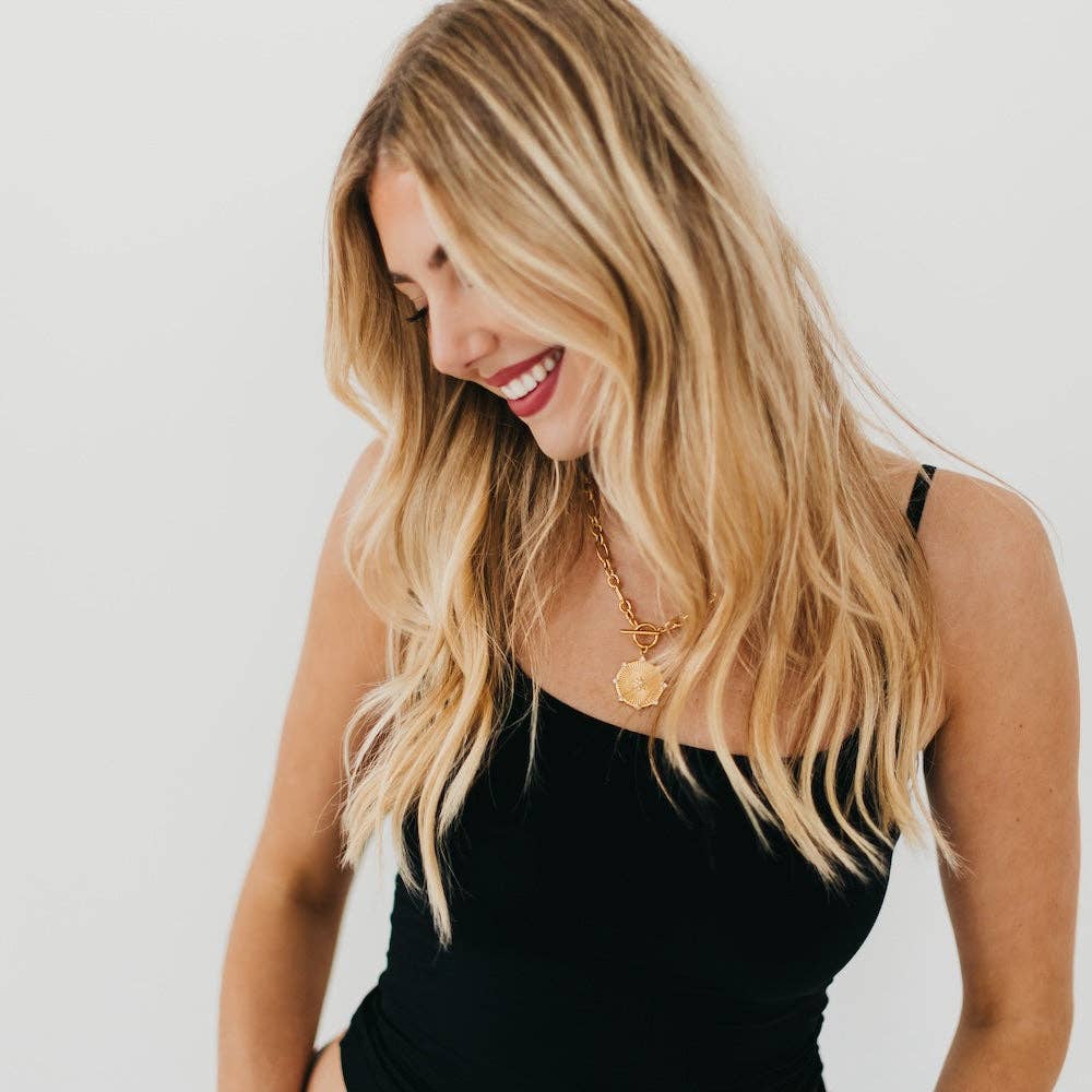Meet your new favorite waterproof accessory - our Sunburst Diamond Chain Necklace! Available in gold, this necklace features a thick chain, a toggle clasp, and a beautiful sunburst pendant with diamonds on it. This accessory will elevate all your favorite looks!