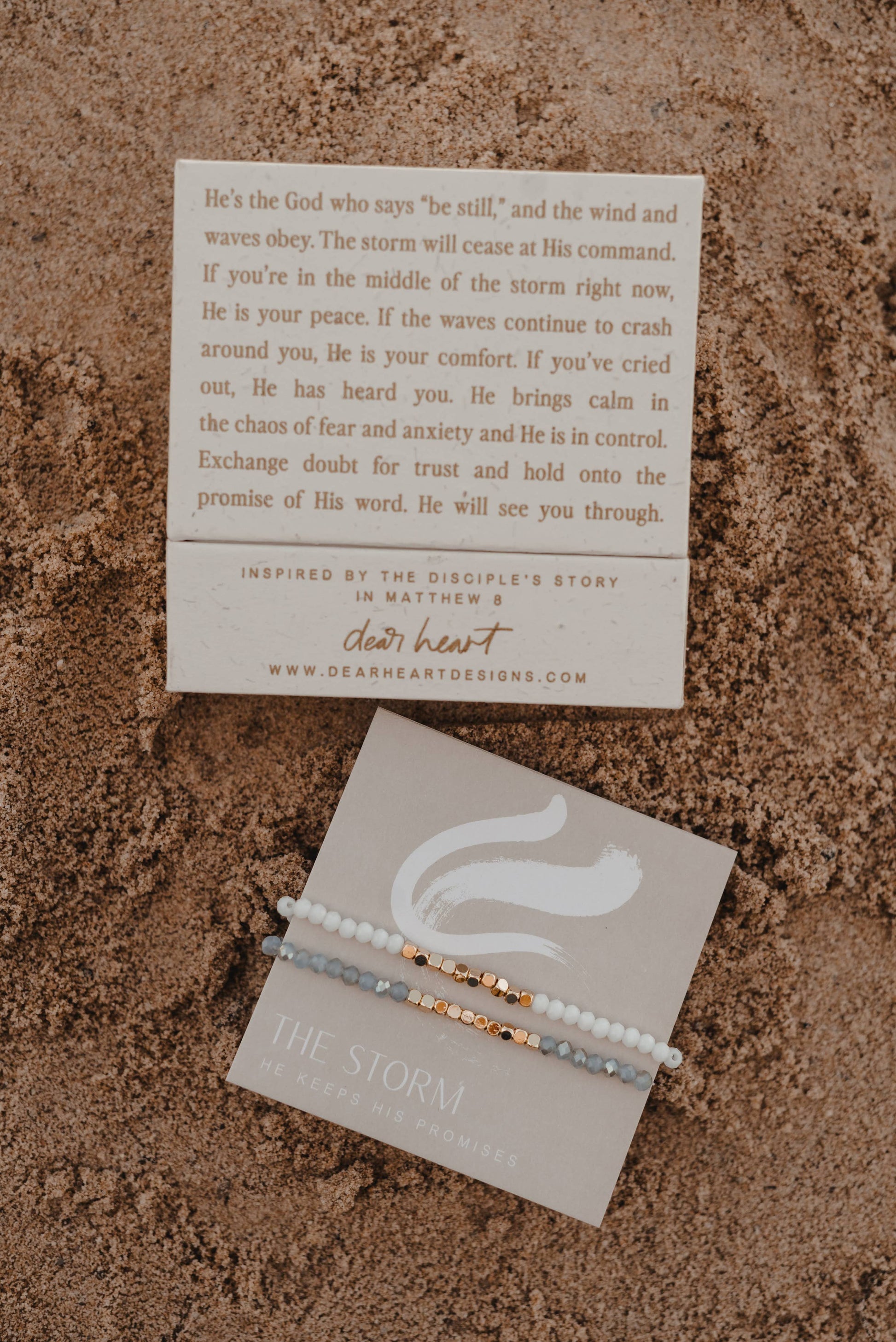 He's the God who says "be still", and the wind and waves obey. The storm will cease at His command. If you're in the middle of the storm right now, He is your peace. If the waves continue to crash around you, He is your comfort. If you've cried out, He has heard you. He brings calm in the chaos of fear and anxiety and He is in control. Exchange doubt for trust and hold onto the promise of His word. He will see you through. Inspired by the Disciple's story in Matthew 8 The misty blue bracelet represents the storm that surrounded the disciples in the boat, while the white bracelet represents Jesus calming the storm around them. We believe these bracelets can truly change the world by creating conversations about Jesus. Our prayer is that they can bring hope to the lost, revival to the weary, and courage for the believer.Â